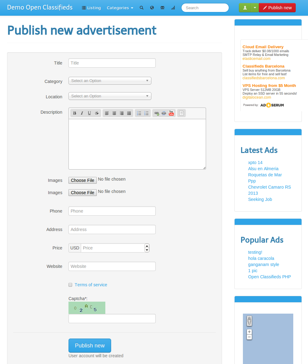 Publish new advertisement ‹ Return to Publish new advertisement 14/06/2013 — No Comments Form for publishing new advertisement (default theme). You choose which fields are displayed in this form from admin panel (Settings>Advertisement).